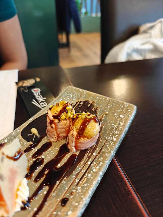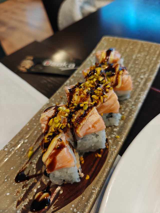 - Salmone, spicy maionese, cetriolo, guacamole, cipollina in salsa teriyaki