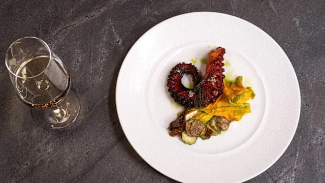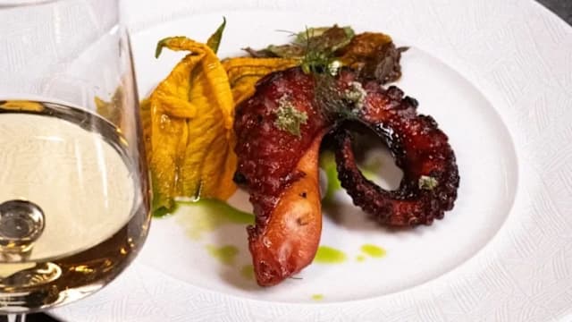 Polpo rosticciato, fiore di zucca ripieno, salsa alla scapece e crumble di pane