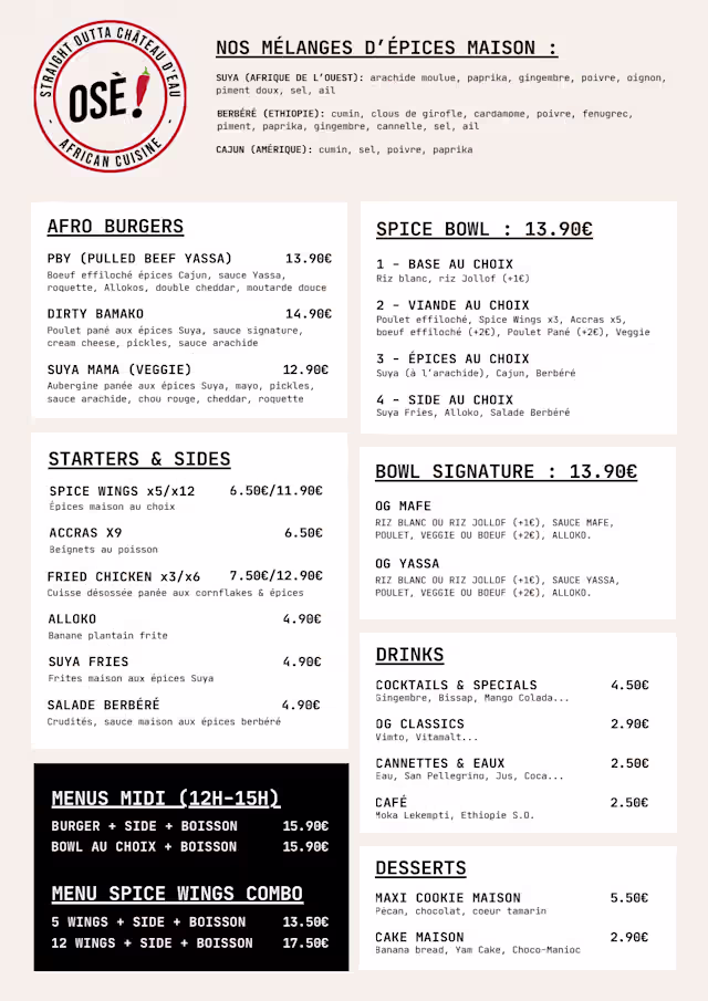 10/10I recently visited Osè and I’m absolutely glad that I did! A special shoutout to Mathieu who was extremely sweet and lovely to accommodate me even though I can’t speak French properly. We ordered the chicken burgers with alocco, and wow, what a treat! The flavours are spot on, the chicken was so crunchy and the aloccos—fried plantains—were perfectly golden and sweet, adding a delightful contrast to the savory burger. The atmosphere was cozy and welcoming, I’ll definitely be back for more, specially for the amazing service :)