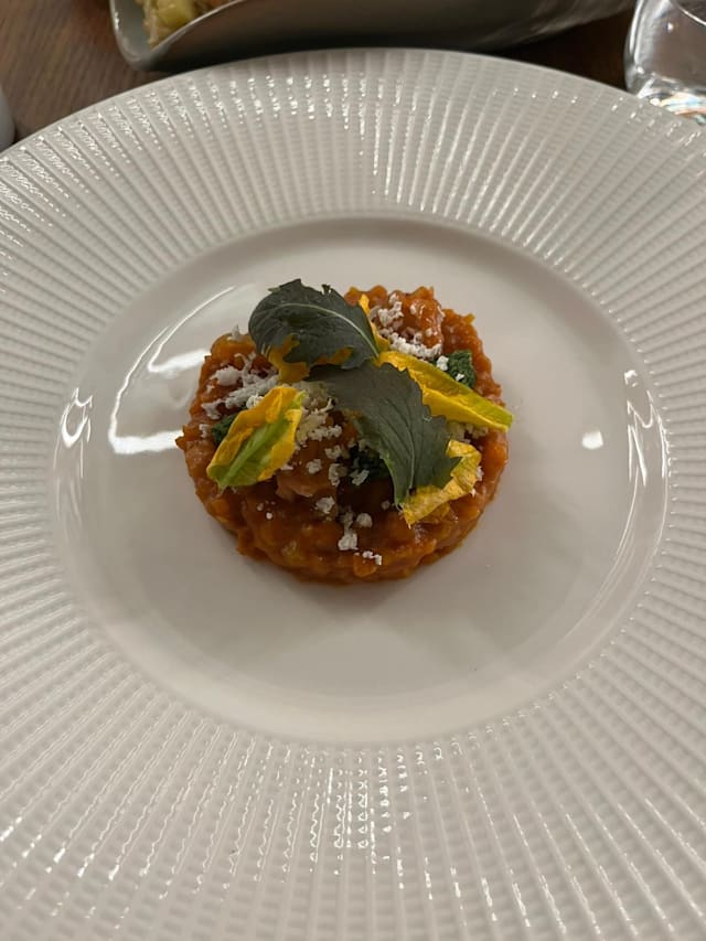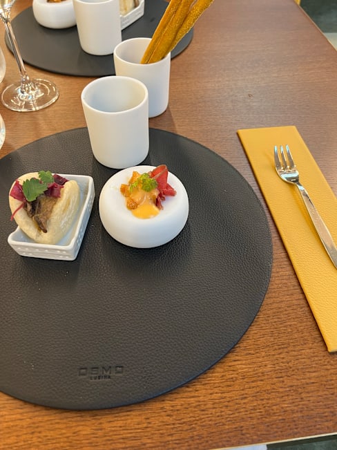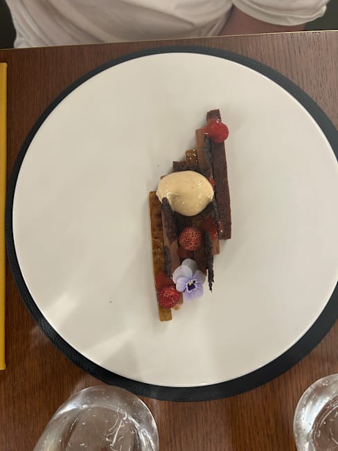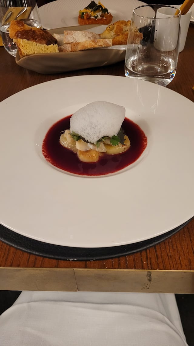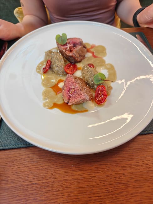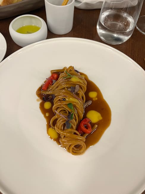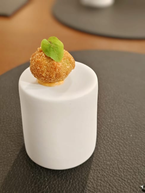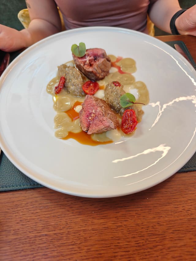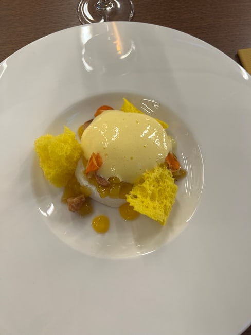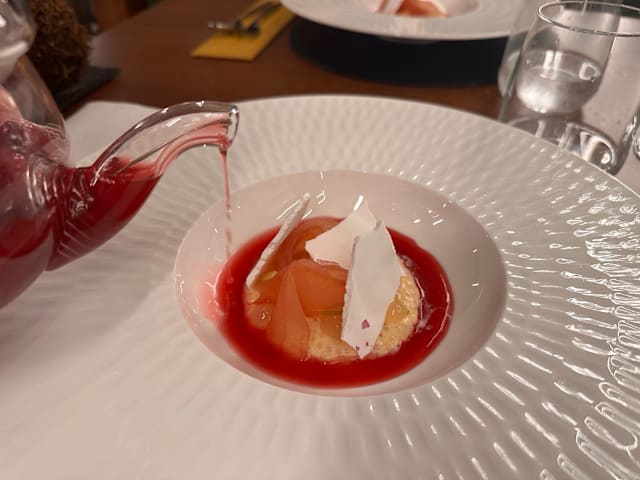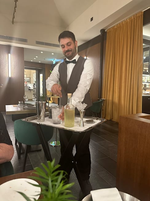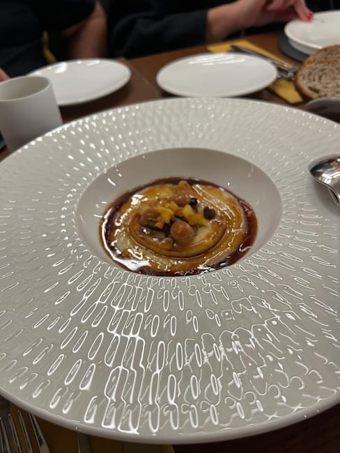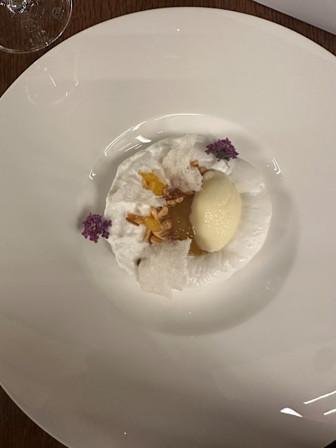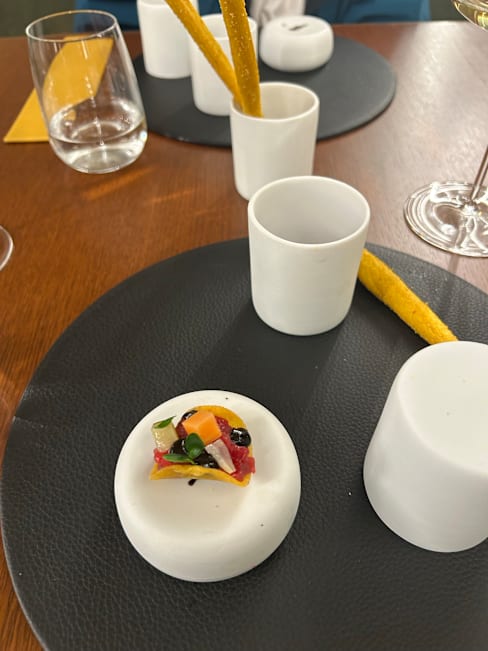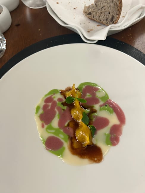 7/10+3The first three courses were actually great we were excited and everything felt perfect. Unfortunately, the second half of the meal was a letdown. The fourth dish was a type of couscous that, in our country, is considered cheap comfort food not something you’d expect in a fine dining experience. Then came another small pasta dish, candy-shaped, but the filling wasn’t good, and having back-to-back doughy dishes just didn’t feel refined. The meat dish that followed was served cold, and the waiter didn’t even bring cutlery with it. Desserts were a mixed bag one was excellent, the other had an overpowering eggy taste and wasn’t enjoyable. They did offer us a complimentary “candy” dessert afterward, which was a nice gesture. Throughout the meal, the waiter kept pouring us wine and water but eventually stopped without a word. He even took away both the wine and the soda before we’d finished them. We ended up paying a lot €264 for two for a meal that really didn’t live up to expectations
