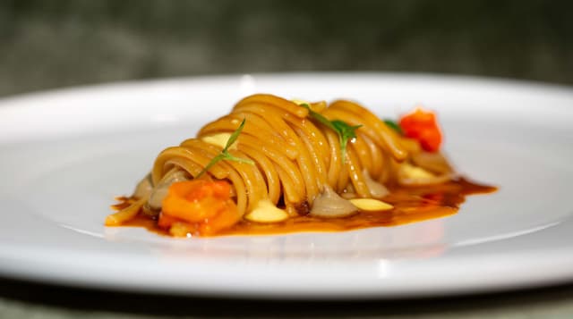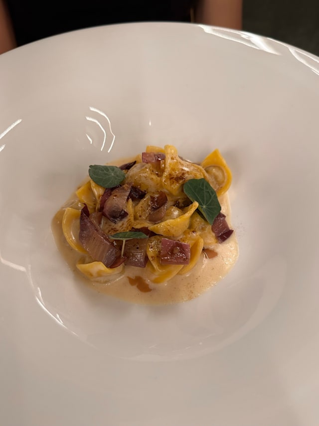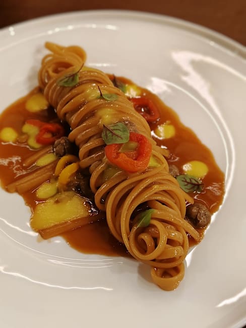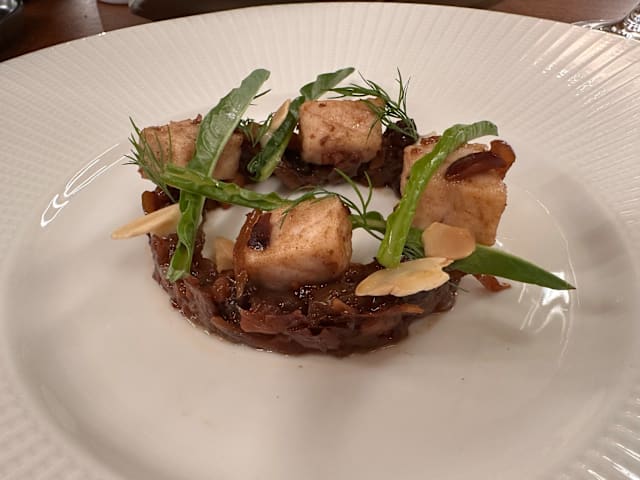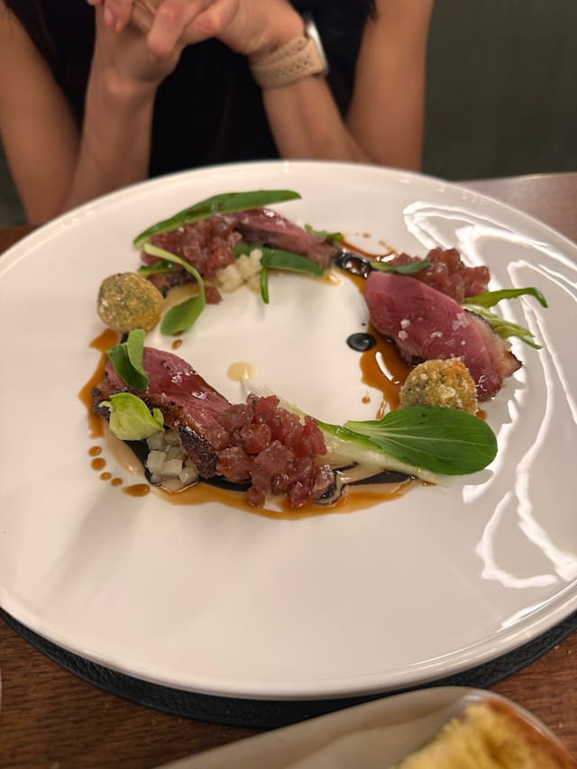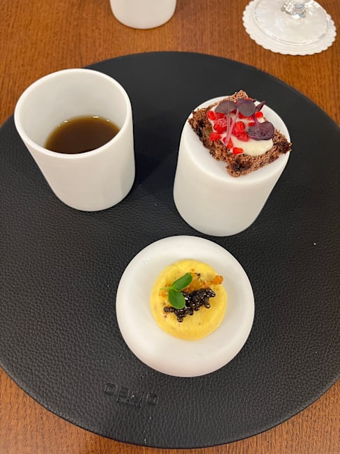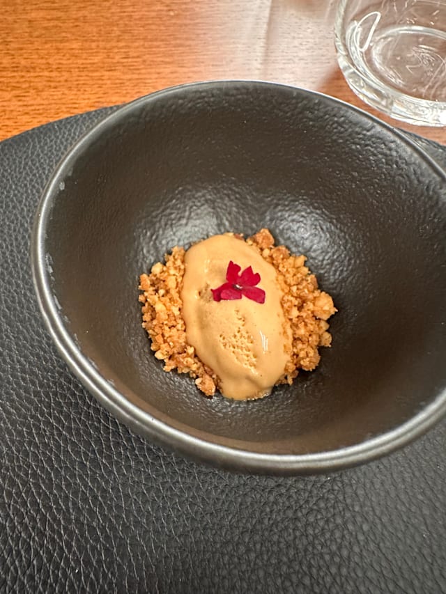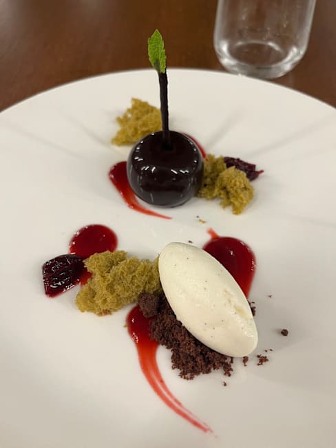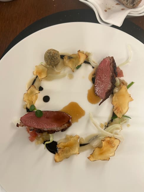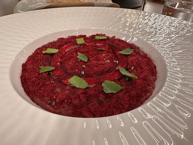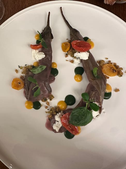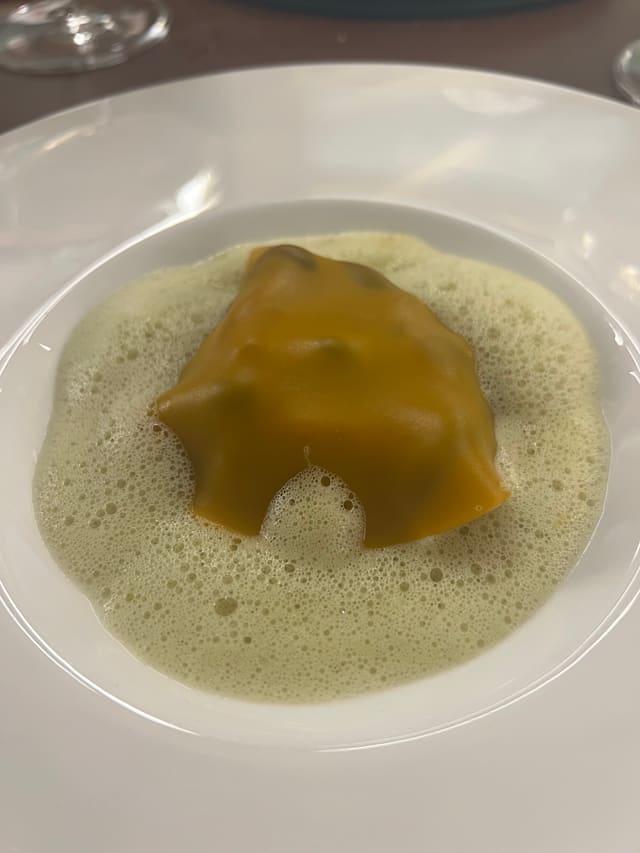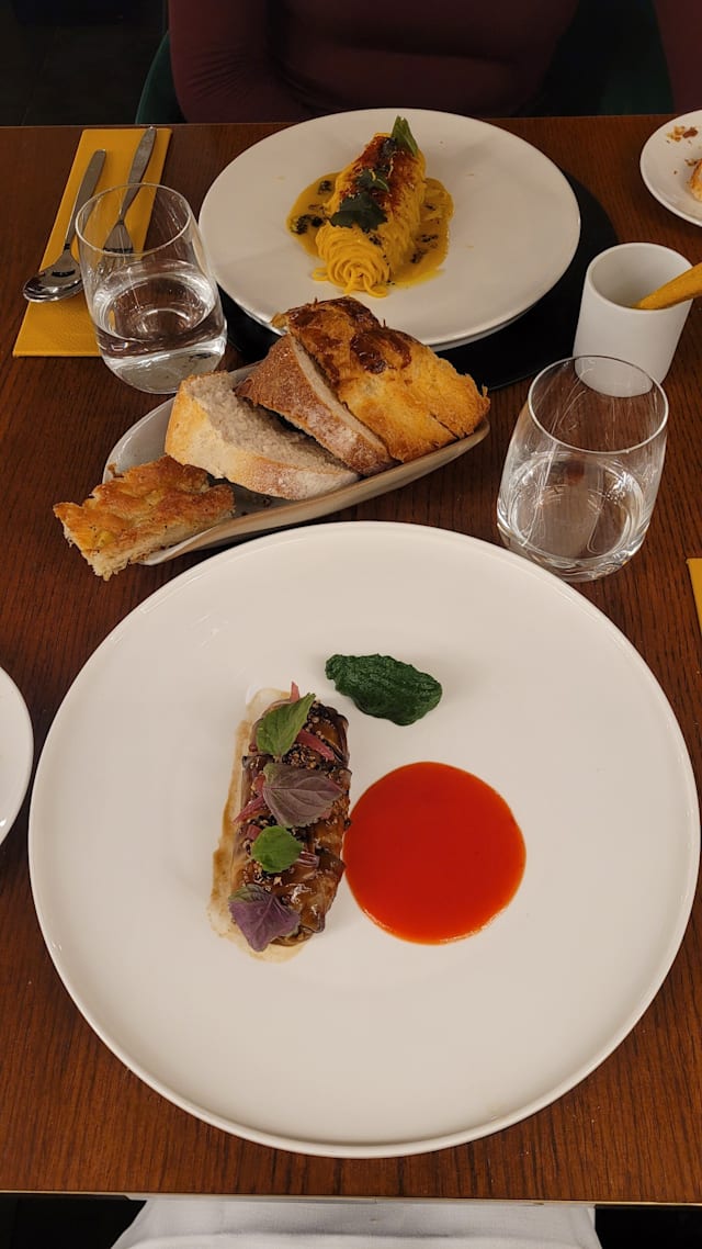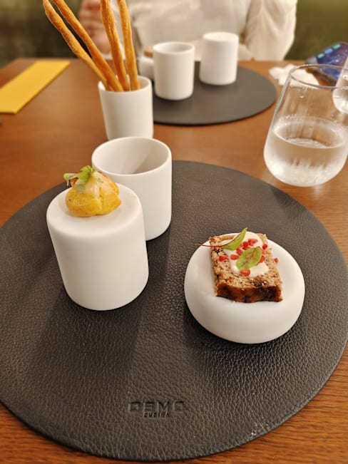 7/10+3The first three courses were actually great we were excited and everything felt perfect. Unfortunately, the second half of the meal was a letdown. The fourth dish was a type of couscous that, in our country, is considered cheap comfort food not something you’d expect in a fine dining experience. Then came another small pasta dish, candy-shaped, but the filling wasn’t good, and having back-to-back doughy dishes just didn’t feel refined. The meat dish that followed was served cold, and the waiter didn’t even bring cutlery with it. Desserts were a mixed bag one was excellent, the other had an overpowering eggy taste and wasn’t enjoyable. They did offer us a complimentary “candy” dessert afterward, which was a nice gesture. Throughout the meal, the waiter kept pouring us wine and water but eventually stopped without a word. He even took away both the wine and the soda before we’d finished them. We ended up paying a lot €264 for two for a meal that really didn’t live up to expectations