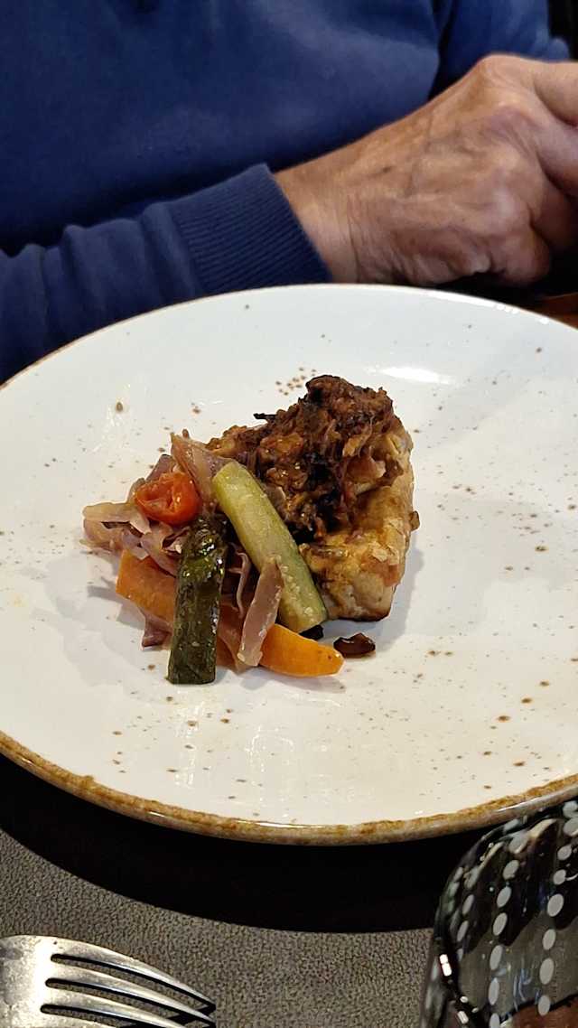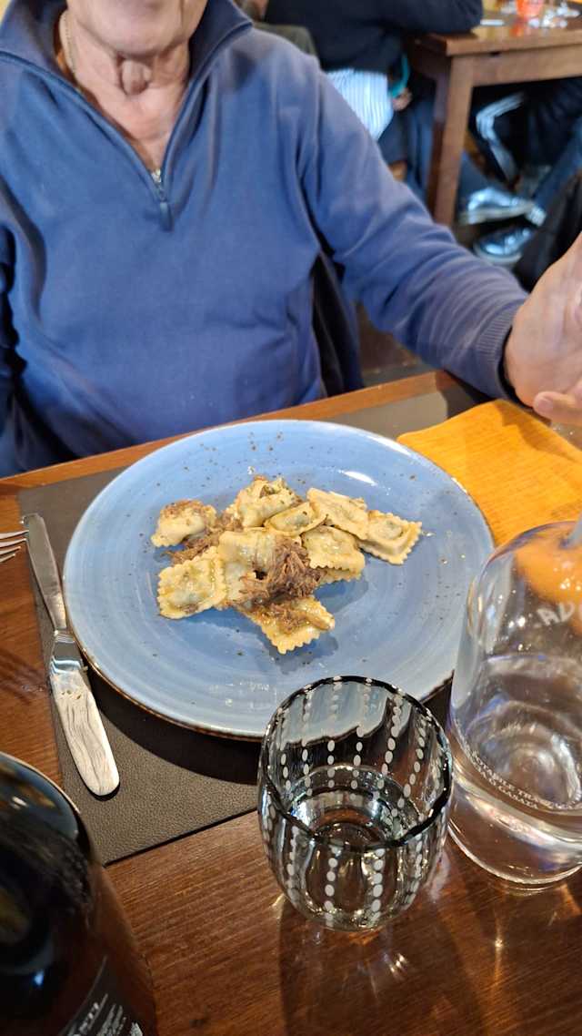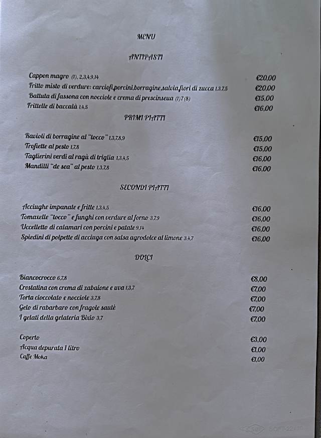 8.5/10Took a bit longer than I thought to find this restaurant, Beware of Google maps! When going from the principe railway station we walked down Via Bolbi, then through a tunnel, then up some steps to the left. Don’t go through the second tunnel! Or go up to the funicular! Anyway once we got there it was good. Portion sizes variable, Vegetable Frito Misti was decent sized/big, Mains (secondi) weren’t over large. If I went again I’d have the anti-pasto, primo and secondi. Food was of a very high standard, mostly fish/seafood based., with delicate flavourings including the use of the borage herb, unusual to me at least. White wine was a choice of vermentino or pigato . No list or price offered! The pigato was great, a good match for the seafood, a bargain at €24, compared to UK restaurant prices. Never heard of it before, it’s surely very much a Ligurian staple, similar to the vermentino grape. All in all a slightly different place very much away from the tourist trail. We ate outside, as far as I could tell most of the rest of our fellow diners were locals, I’d have thought that the two dogs at our neighbouring table hadn’t come that far in any case! They were kept in good check by their owners. It’s that kind of place!