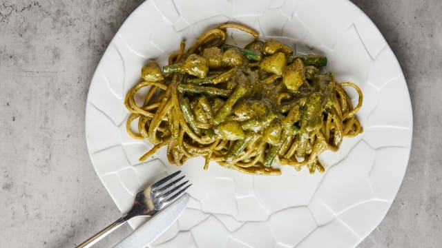 Trofiette de castanya al pesto genovese DOP amb mongetes verdes i patates