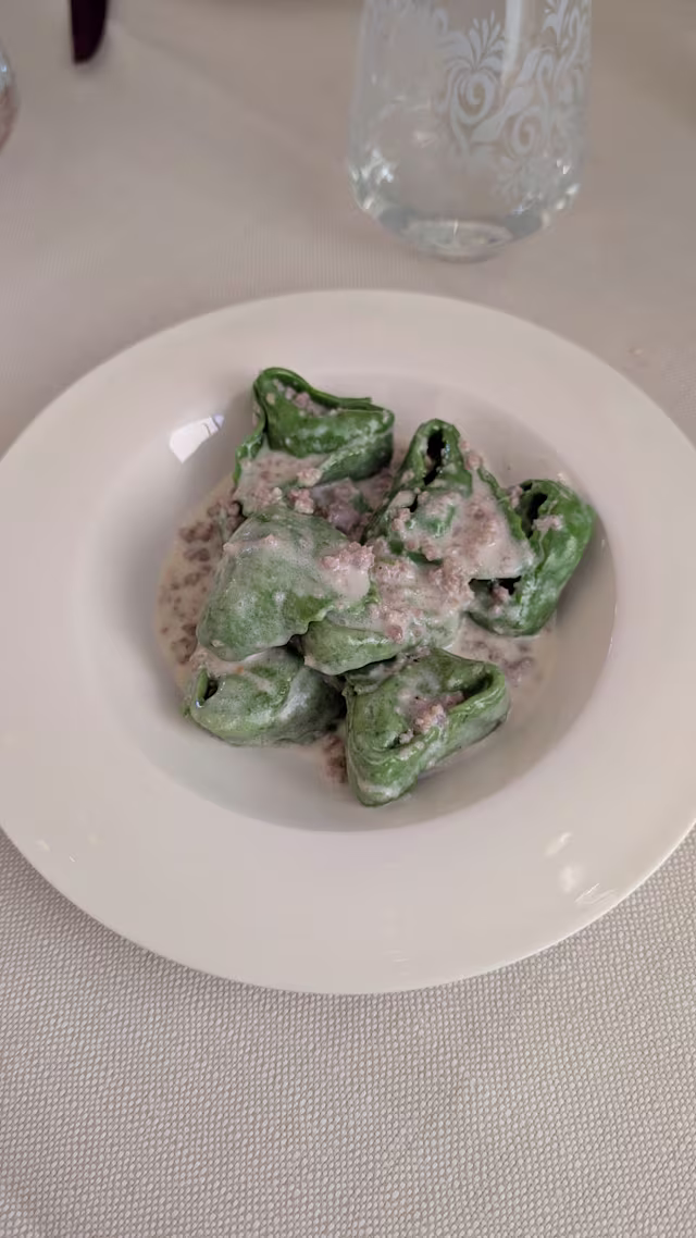 - Tortellone verde ripieno di mortadella, condito con mascarpone e salsiccia