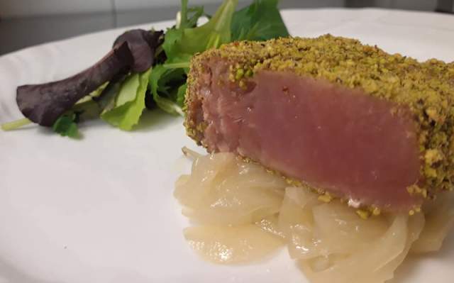 - La tagliata di tonno in crosta di pistacchi su cipolle agrodolce