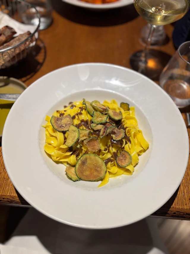 - Home made tonnarello with artichokes, crispy cheek pork and roman pecorino cheese