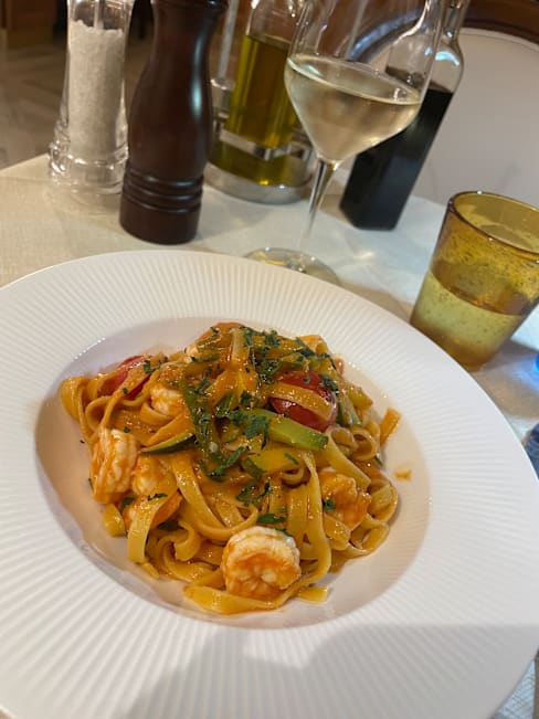2.5/10We ordered a cheese plate. Got 8 slices of cheese, two slices of Bree two of Swiss two of blue cheese and one that we didn’t know. Not very exotic. I ordered pasta -ravioli. It was not cooked enough. The scampi was tiny, hardly any meat for the price. Nothing else on the plate. It too forever to get the cheese and our dinner. Poor value. Disappointed.