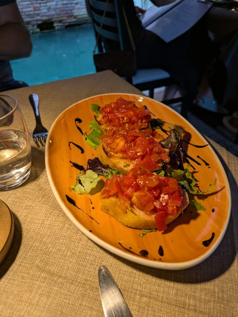 9/10The service was friendly and fun. We were seated outside in a little alley beside a canal. We watched fish! Amazing! Bruschetta was good. Carbonara was small portion but tasty. Lasagna good size. Both very rich. Close tables so we ended up chatting with couple next to us. Great atmosphere and service.
