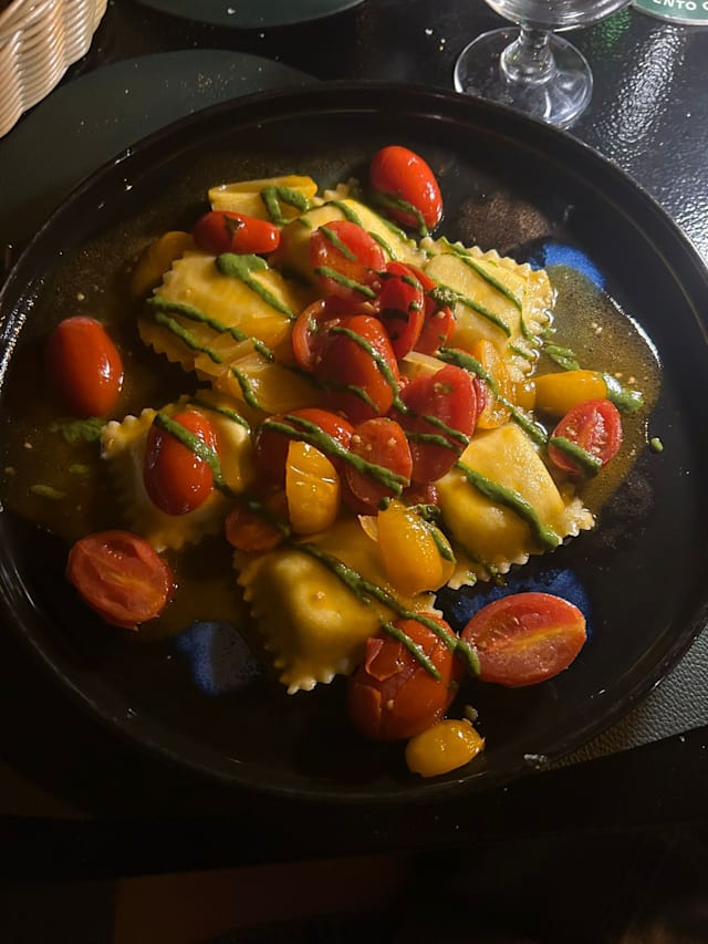 Ravioli freschi con cuore di burrata, serviti con pomodorini gialli e rossi per un equilibrio perfetto tra dolcezza, cremosità e freschezza.