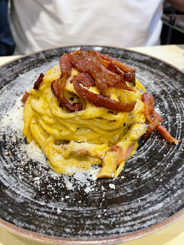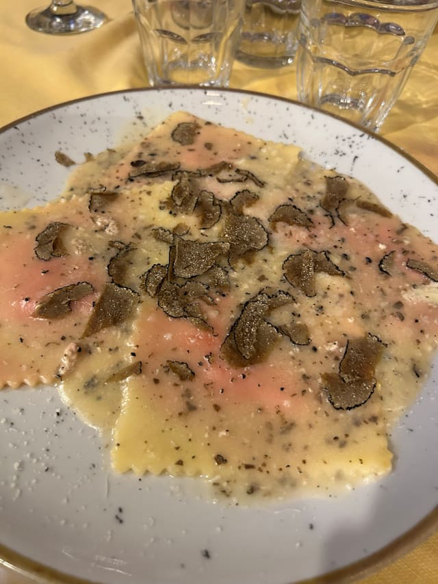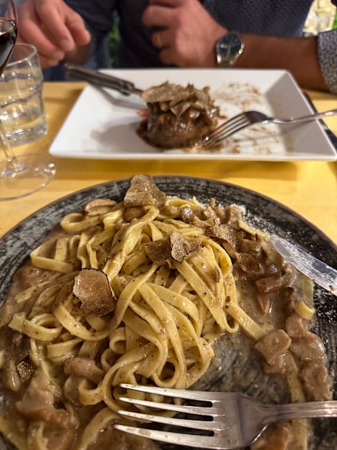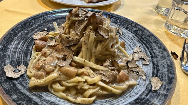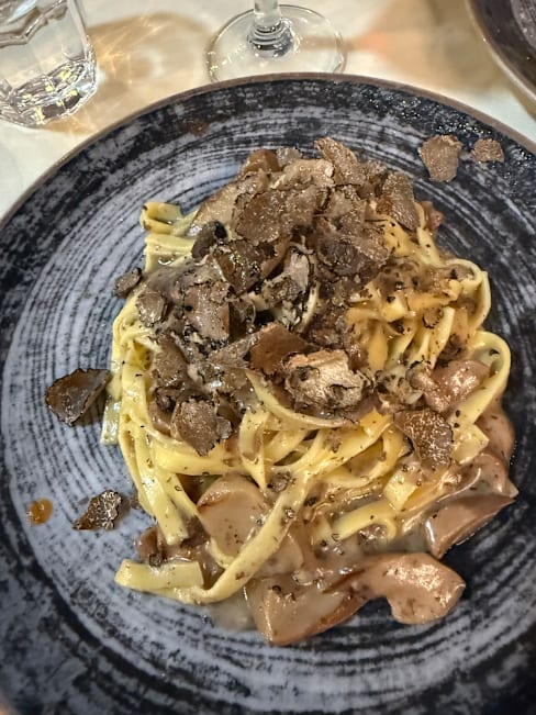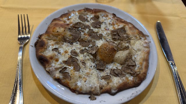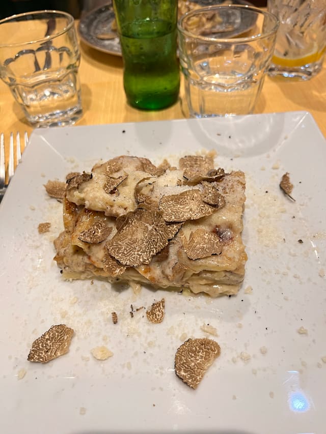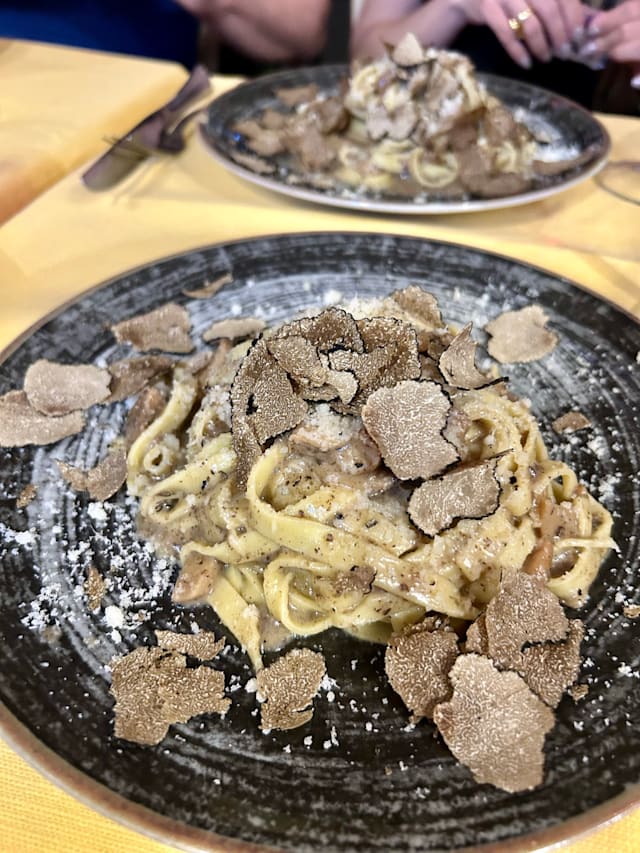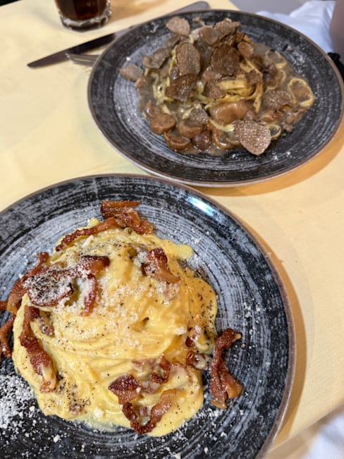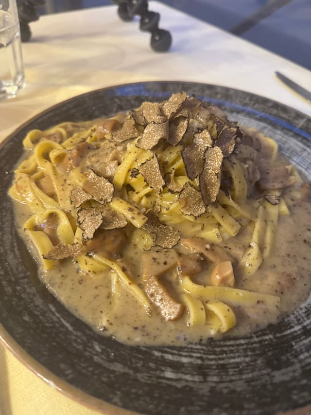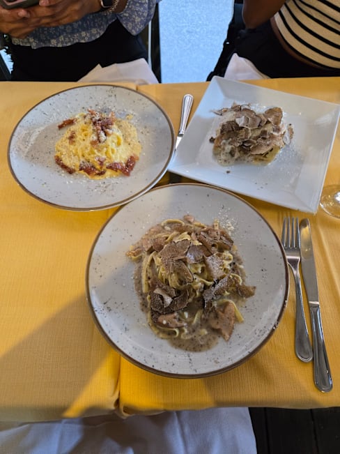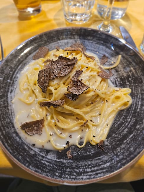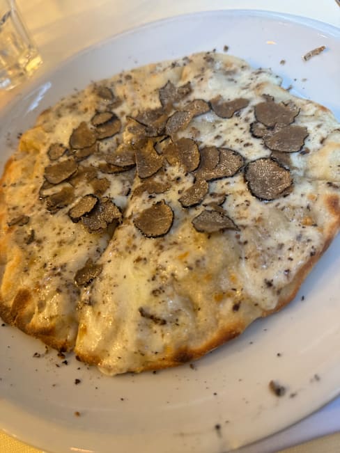 7/10the restaurant attracts many asian tourists. I suppose we all read from other reviews to go. You must make a reservation in order to get a table. The portion is very large for one person. I order the Forcaccia with Black Truffle which is good but the portion is a 8” pizza. The fettuccine con tartufo is also great. Given the size I couldn’t finish both.