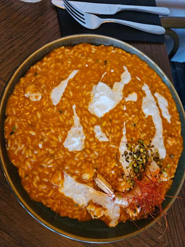 3/10Food was very disappointing a prawn risotto servers on a flat plate with one whole prawn on top and supposedly pieces of prawn in the rice minute bits and very few no pistachio crumbles as on menu, very very poor Last time we went there in May the food was good Recommended it to friends, embarrassing never again!
