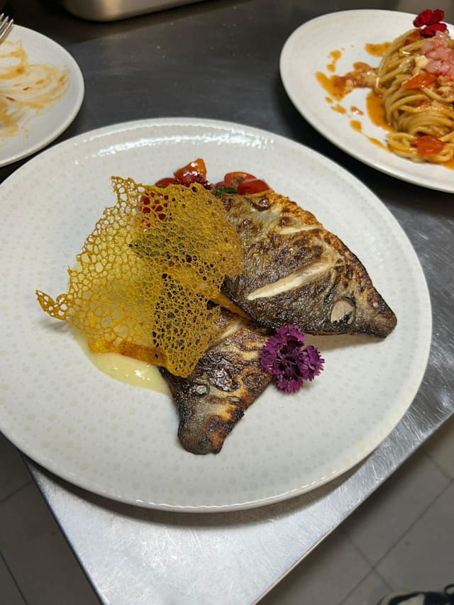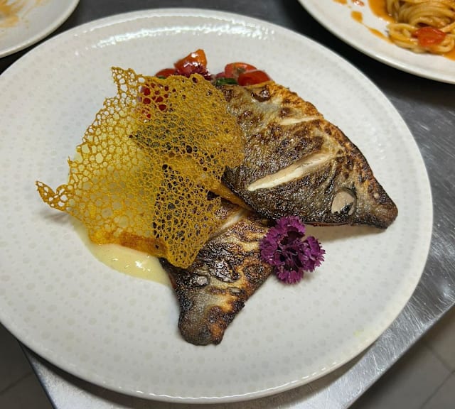 Filetto di branzino* scottato al timo servito con crema di patate, datterini freschi, olive, capperi, basilico e menta