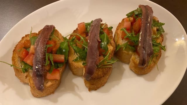 Un'esplosione di sapori mediterranei. Crostino di pane croccante, dadolata di pomodori e rucola, acciughe del mar cantabrico, profumati con olio all'aglio, e pepe nero. Un morso, pura poesia