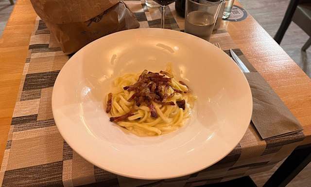 - Pasta alla chitarra con fonduta di casera della valtellina e guanciale croccante
