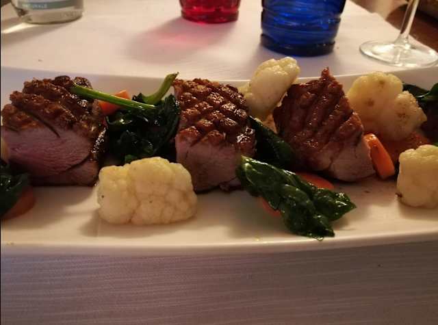 - Petto d'anatra CBT con riduzione di porto all'arancia, purè di patate e dadolata di barbabietola