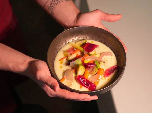 - Crema di porro allo zenzero, carote croccanti al rosmarino, cavoletti di bruxelles al burro e petali di cipolla agrodolce