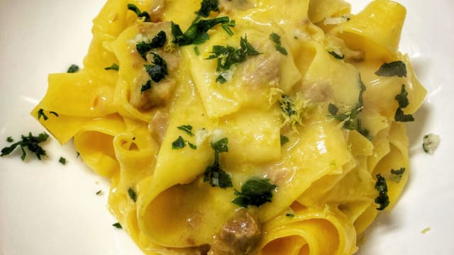 Pappardelle all’uovo con ragù di ossobuco, crema di zafferano e la sua gremolada