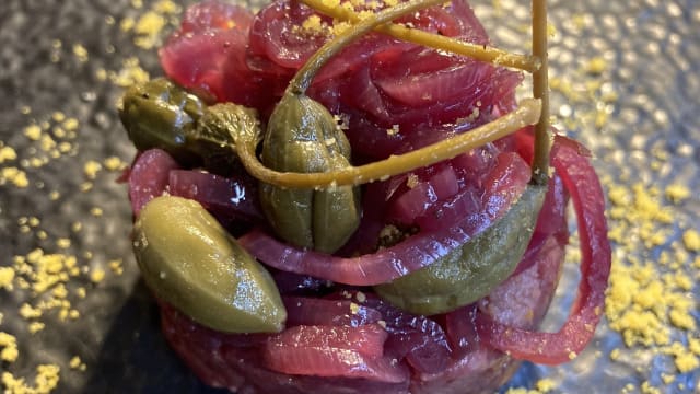 Battuta di manzo, cipolle caramellate, fiori di capperi, tuorlo marinato e glassa di aceto