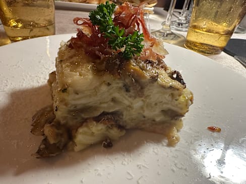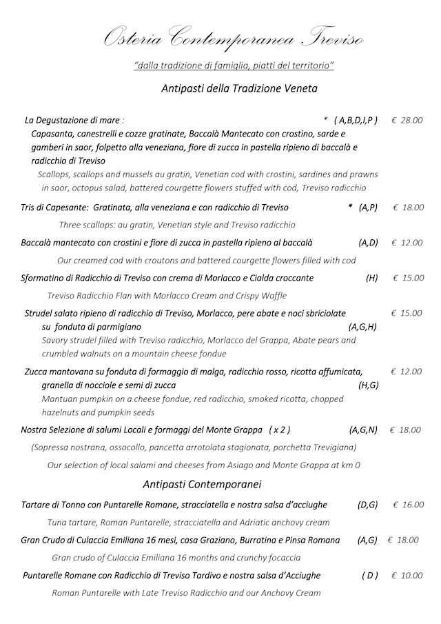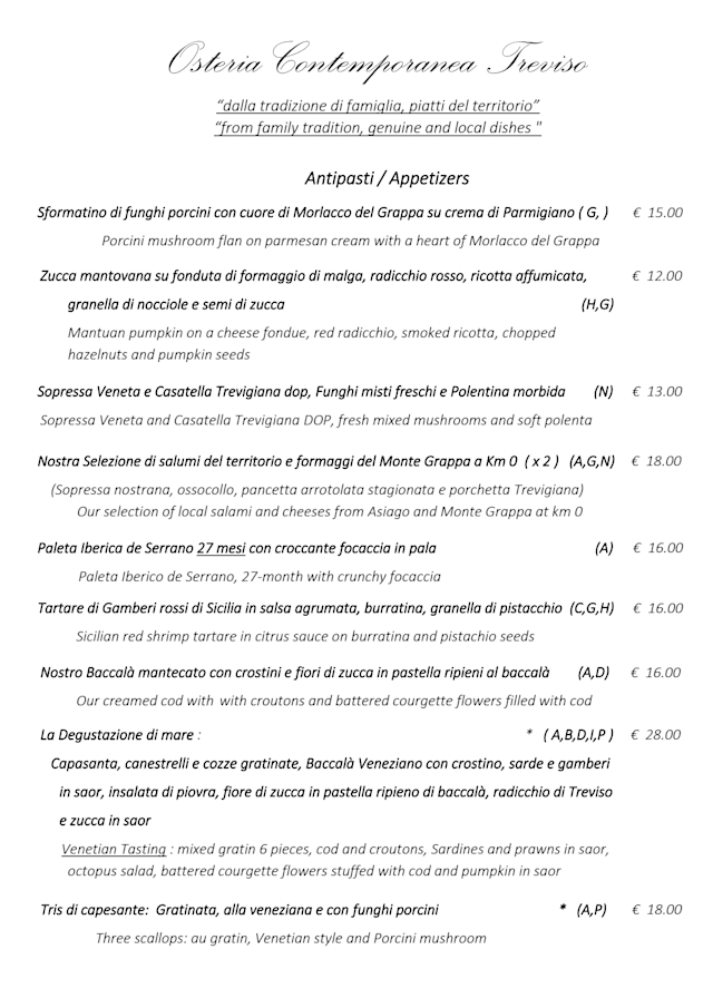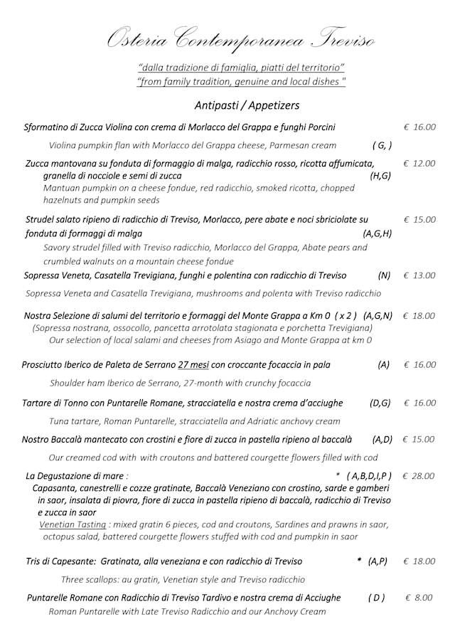 10/10The menu is atypical and interesting, variations on traditional dishes. Scallops are rarely on the menu in Central Italy trattorias, so it was a treat to discover them here. An Antipasto of scallops with three sauces was delicious, the scallops the most tender I have ever had. My wife had tuna tartare with buratta cheese...a beautiful plate and also very good. She had a different scallop dish as her secondo...cooked three ways, and all tasty. I had a porcini lasagna...again something different and very good. And then a turbot fish millefoglie...I had to ask what that was. Turns out that instead of pastry enfolding the veggies, the fish was in layers. Tiramisu is a must in Trevisa which claims to have invented it. I find the dish usually boring, but this place had surprised me again and again, so I ordered it. And it met the test....definitely the best we had ever had and something I would order again...at least at this fine trattoria.