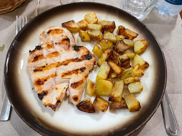 Petto di pollo grigliato, servito con patate al forno croccanti, aromatizzate con rosmarino e olio extravergine d'oliva