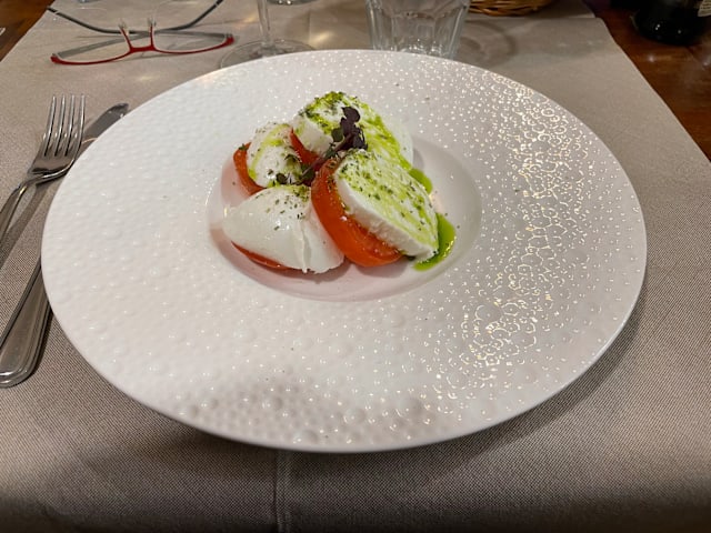 Mozzarella di bufala, pomodori e condita con olio di basilico