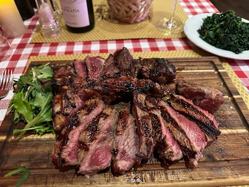 4/10The listed price for the Chianini Florentine Steak was posted at $78 for 1.2kg for two people. The bill came in at $93.50. When asked why, they said the cost is based on $78/kg. I felt this was deceptive. I pay attention to detail and did not see this in the menu. Sneaky. Also, the steak was not good. Can get far better quality for a basic ribeye in Canada for $25. Very disappointed.