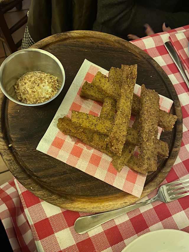 7.5/10There are a lot of polenta options, we tried just the side out of curiosity - found it strange, never had it before. We found the meat dishes were lovely. An actual cured sausage for a starter was fun! Boar ravioli was super nice, daughter wasn't too keen on the chestnut flavoured pasta (personal taste, she was trying to be adventurous) but enjoyed the mozzarella+sausage+sauce that came with it. Drinks good value and we enjoyed the house red. A different sort of meal.