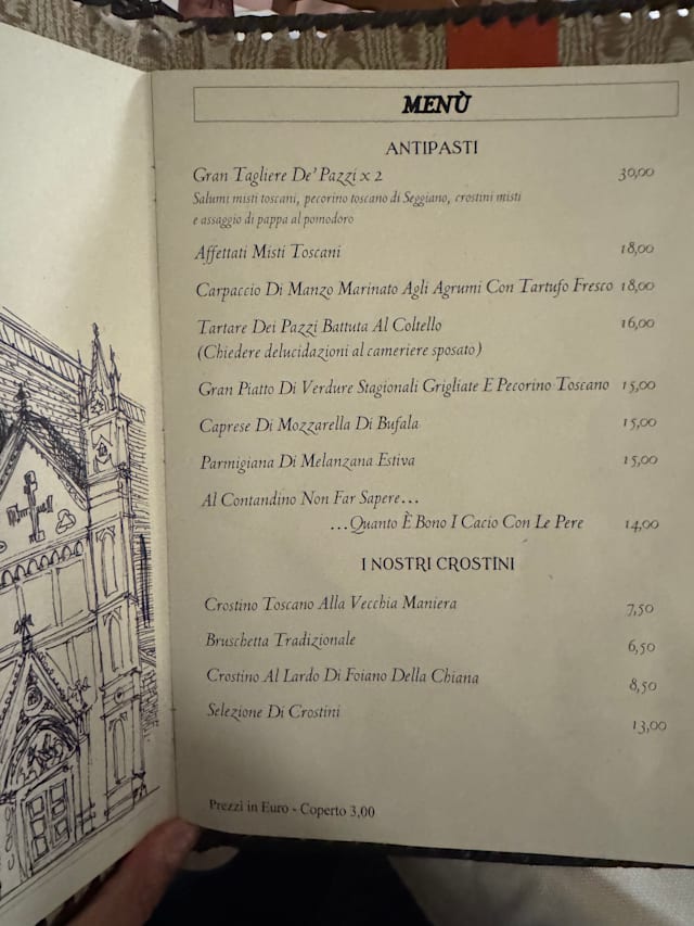 10/10Osteria Dei Pazzi was a small place with inside and outside seating. The food was fabulous but not over priced. Service was friendly and attentive. Would highly recommend