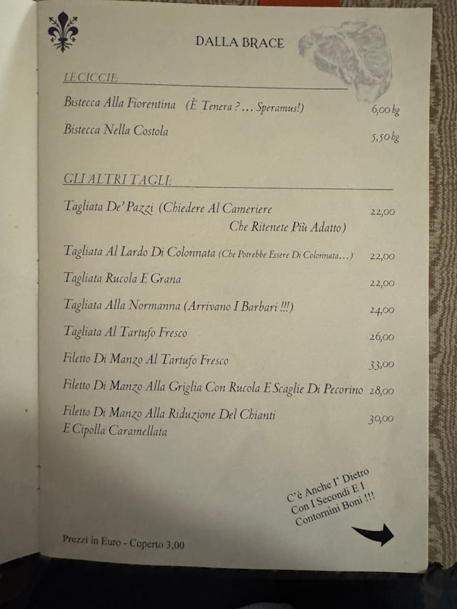 10/10Beautiful food, great service in this wonderful family-run restaurant. Highly recommend the fiorentine steak (comes by the kg) and the beautiful truffle pasta. We were the only English speaking people in there - always a good sign!