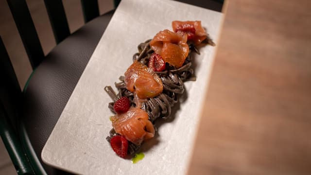 Tagliolini al nero di seppia, ragù bianco di seppia, 'nduja di mare