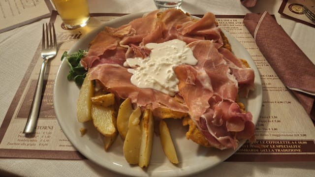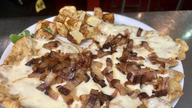 con cipolle caramellate,bacon,stracciatella,patate al forno e gnocco fritto