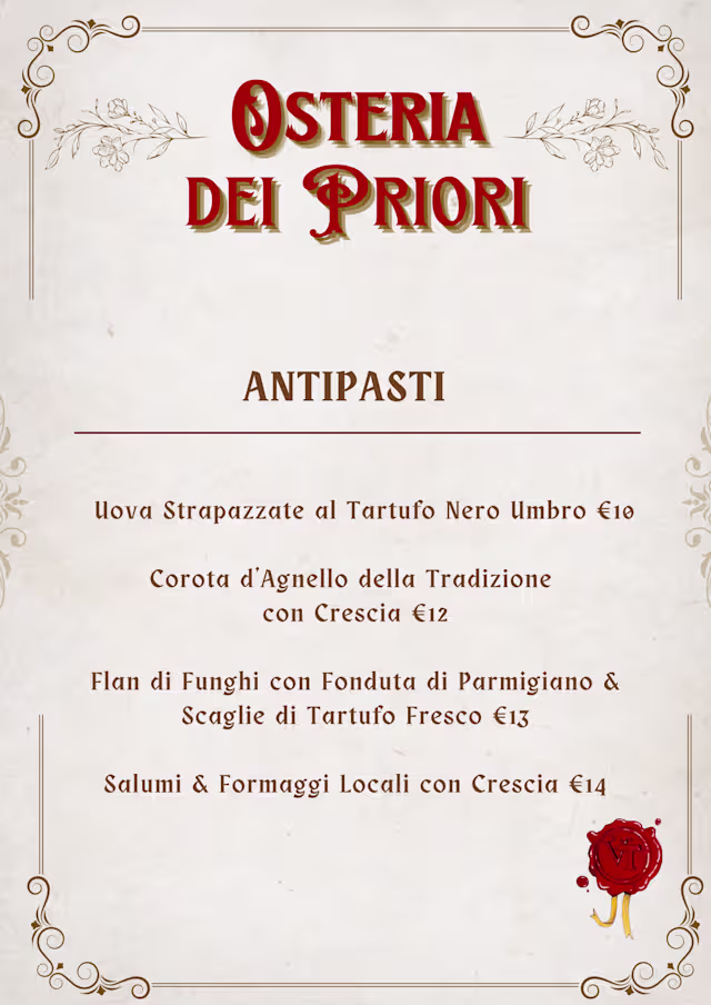 Osteria dei prioriThank you for your feedback, we're really happy to hear you enjoyed the food, the menu, and the overall value. We’re sorry if the service felt a bit distant at times. As a small team with just one waitress and one chef, it can occasionally be challenging to give each table the full attention we’d like, but please know it was never our intention to come across as dismissive. We always do our best to make every guest feel welcomed and well looked after, and we truly appreciate your understanding. We hope to have the pleasure of welcoming you again soon! Warm Regards, Osteria dei Priori - Assisi