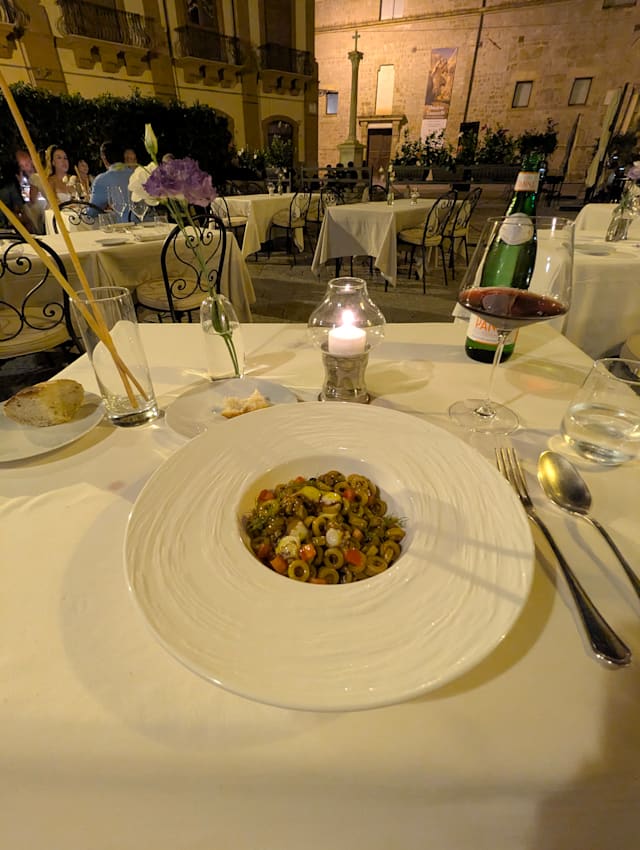 6/10My family and I were very excited to try Osteria dei Vespri. The restaurant was recommended from a dear friend of mine that lives in Palermo. The food presentation was lovely. A beautiful restaurant in a wonderful little plaza. The restaurant quiet and clean, and the host and the restaurant were very kind and lovely to my son. Unfortunately the elephant in the room was the taste of the food. Overpowering flavors like red peppercorn on several dishes. The lack of salt and umami and every dish. Extremely overpriced for a small Osteria. I wish the food was a lot better. I would’ve definitely came back for the ambience.