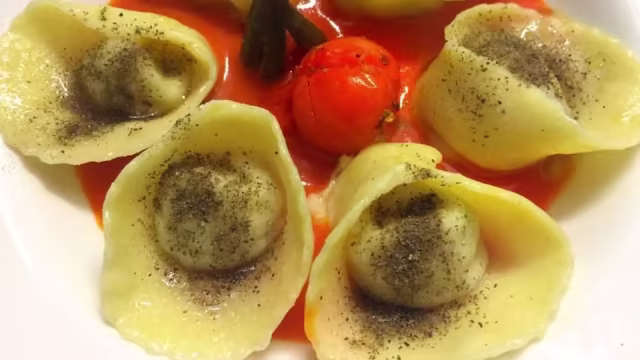 - Vellutata di seppia al nero, profumo d'alloro, raviolini al pomodoro, piselli, patate e zafferano