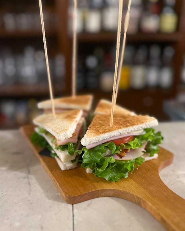 - Club Sandwich doppio strato di pane bianco con bacon croccante, petto di tacchino, lattuga, pomodoro, fontal e maionese