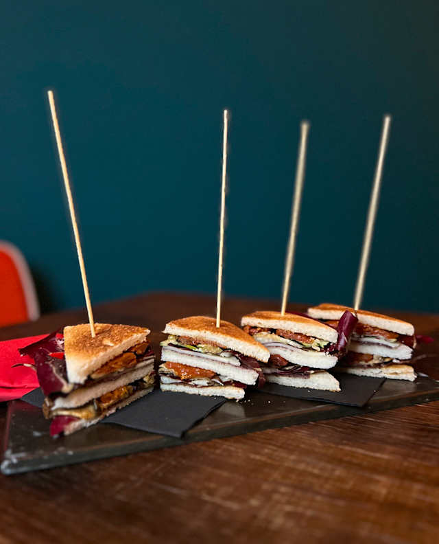 - Green Sandwich, doppio strato di pane bianco con melanzane e zucchine grigliate, radicchio fresco, pomodori secchi, fontal e patè di olive nere