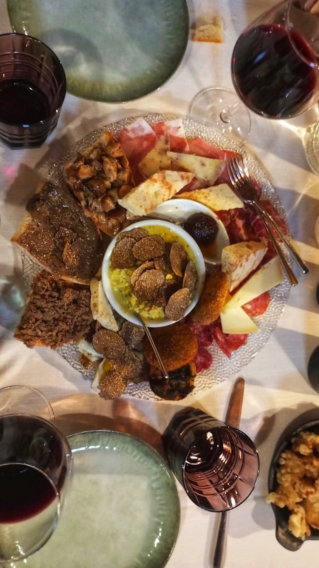 Bruschette con porcini, tartufo e paté; strapazzata al tartufo; affettati e torta al formaggio; mix di formaggi con confettura di cipolle; quiche agli spinaci e salsiccia; polpettine fritte di Black Angus e tartufo