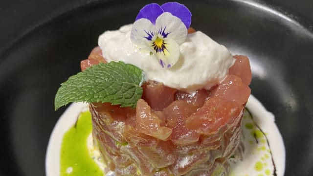 Tartare di tonno rosso all’olio tartufo, stracciatella e granella di pistacchio