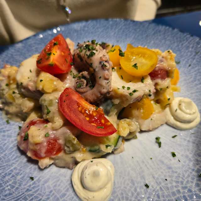 Polpo tenero croccante su patata mantecata al limone e pane carasau