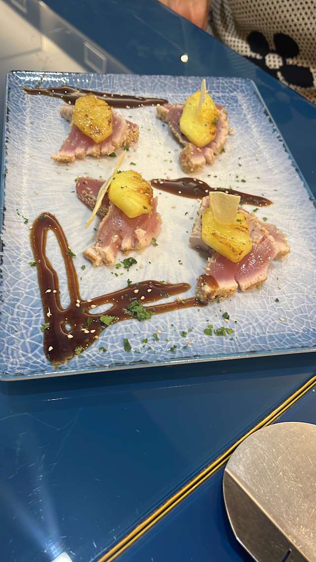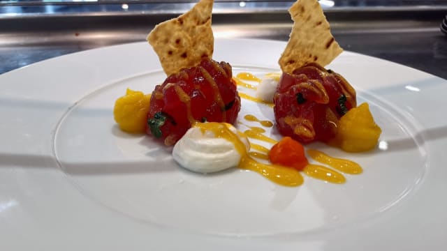 Tartare di tonno pinna gialla, cremosa al limone, frutto della passione e mente, stracciatella