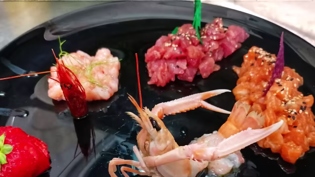 - Tonno con kataifi croccante, salmone con stracciatella di burrata e pistacchio, pescato del giorno