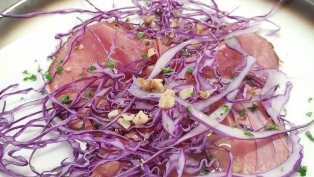 - Manzo marinato, cavolo viola, salsa di noci, aglio, noci
