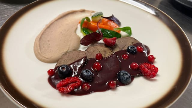 - Girello di manzo cotto a bassa temperatura, Herbetet, tonno, tuorlo d'uovo pastorizzato, limone, capperi acciughe, olio, sale e limone