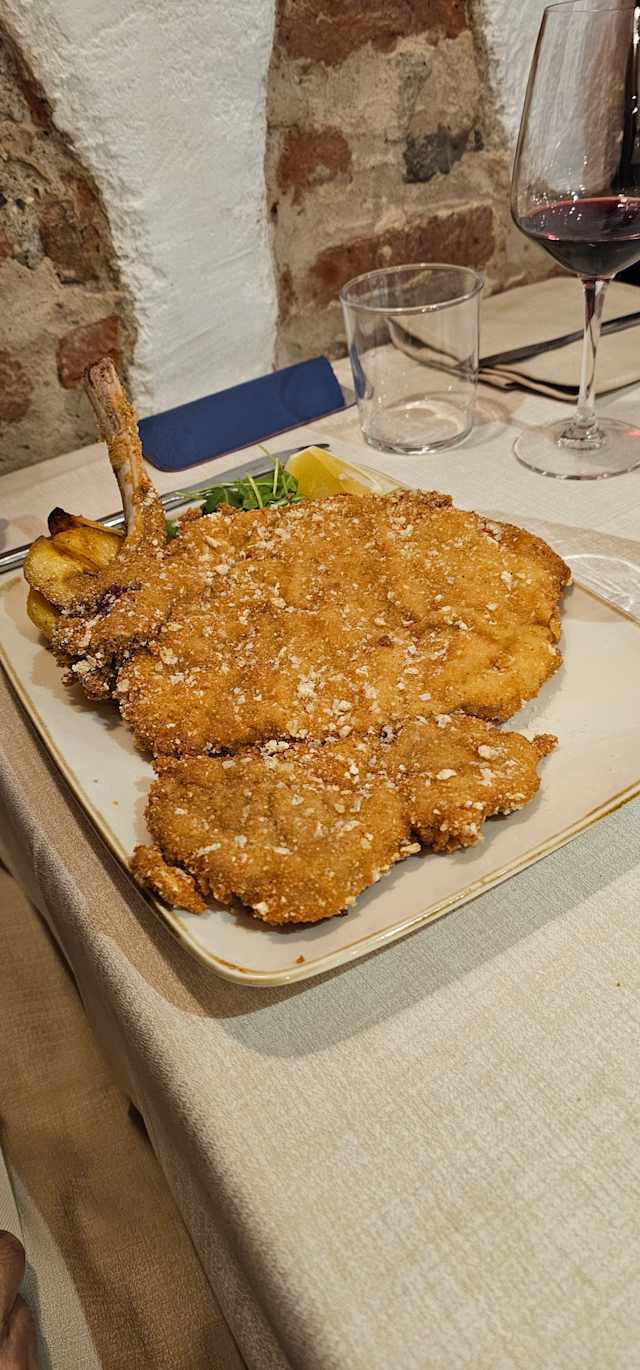 - Cotoletta di vitello fritta nel burro chiarificato con patate al forno, rucola e pomodorini
