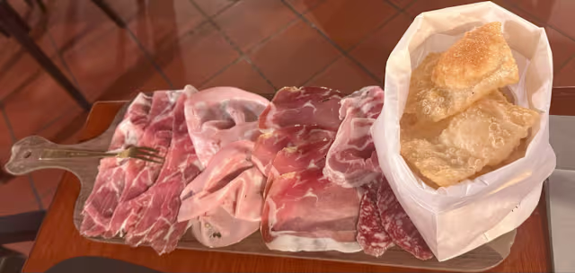 - Prosciutto crudo 27 mesi, fiocchetto, salame Felino, pancetta Piacentina, mortadella IGP, giardiniera della casa e gnocco fritto