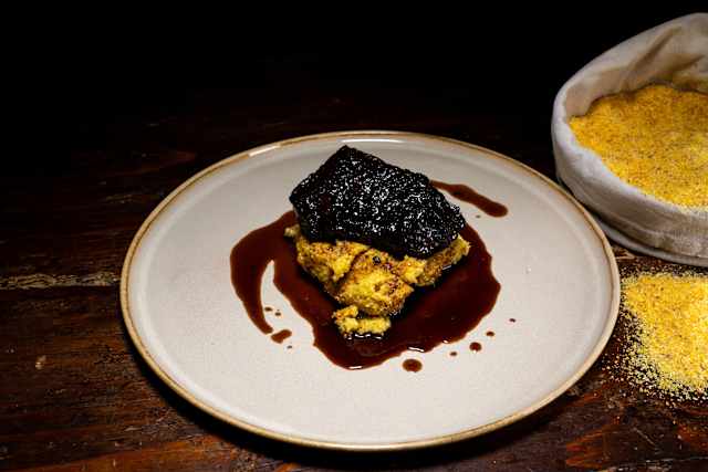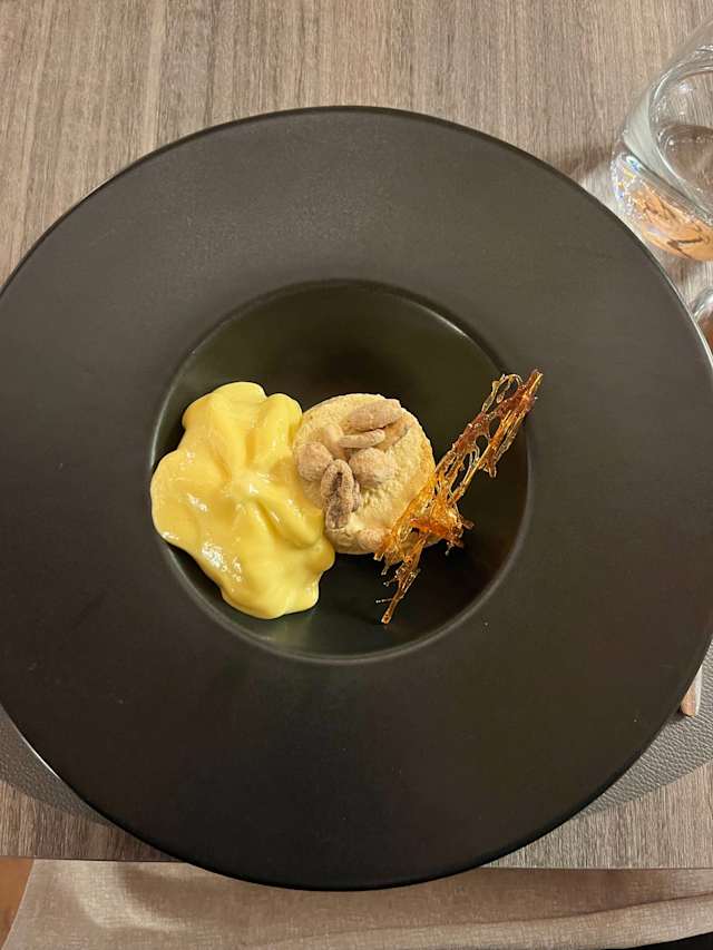 - al mattone con insalatina riccia ed emulsione di birra e aglio nero