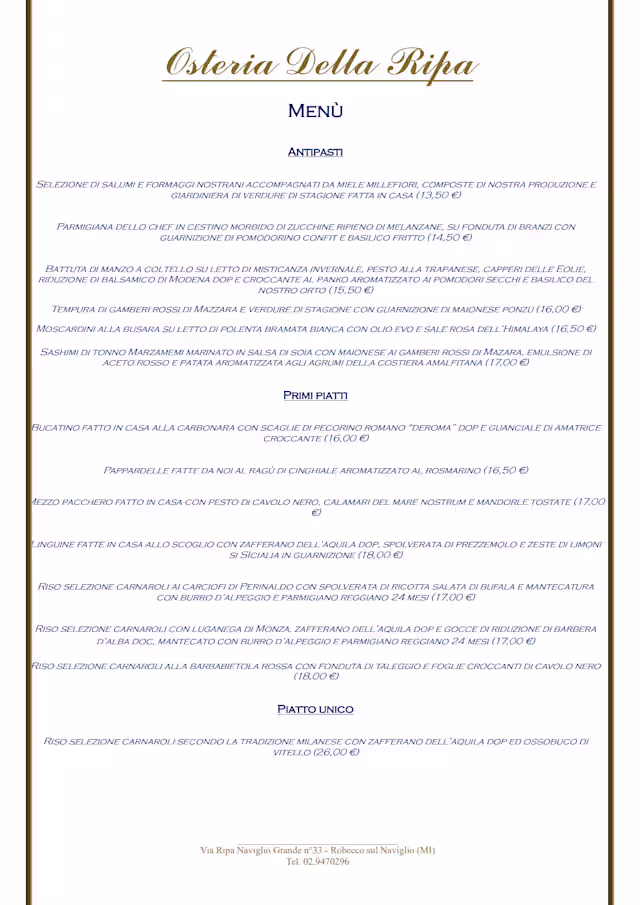Cucina tradizionale e creativa, in un ambiente accogliente ed immerso nel suggestivo contesto del Naviglio Grande e del borgo storico di Palazzo Archinto.