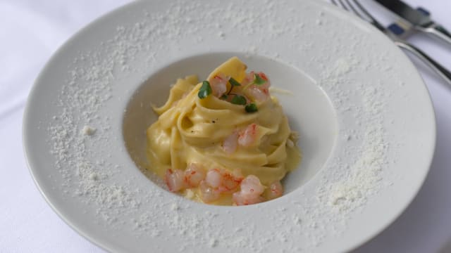 Tonnarelli cacio e pepe con crudo di gamberi rossi
