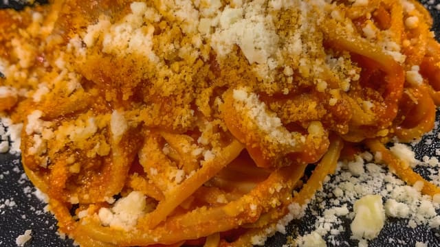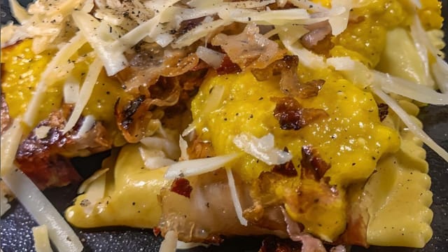 Originale creazione dello chef, composta da guanciale, pancetta, uovo, pecorino e parmigiano