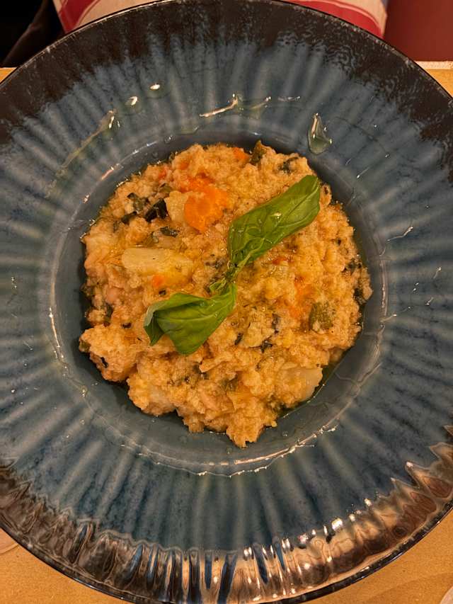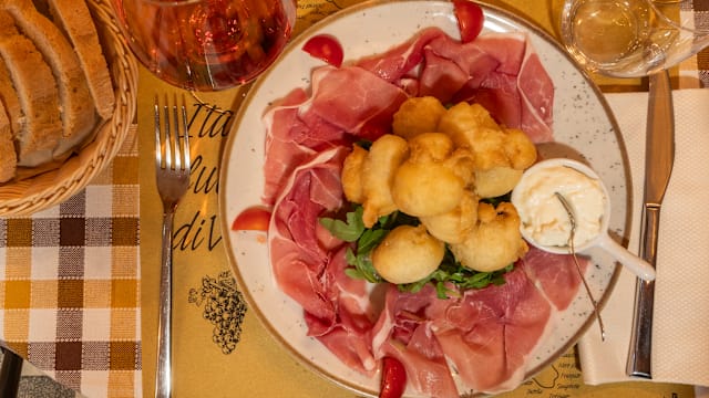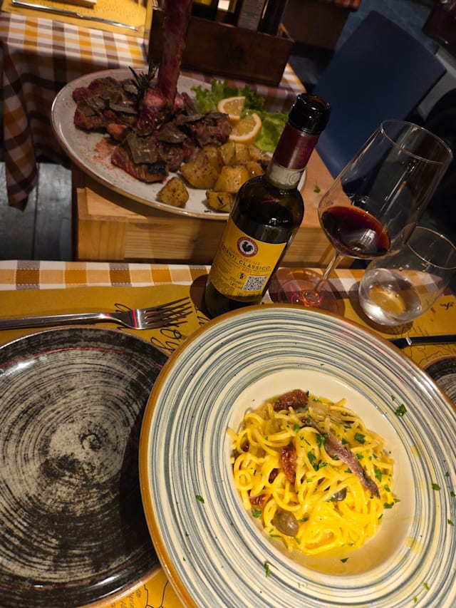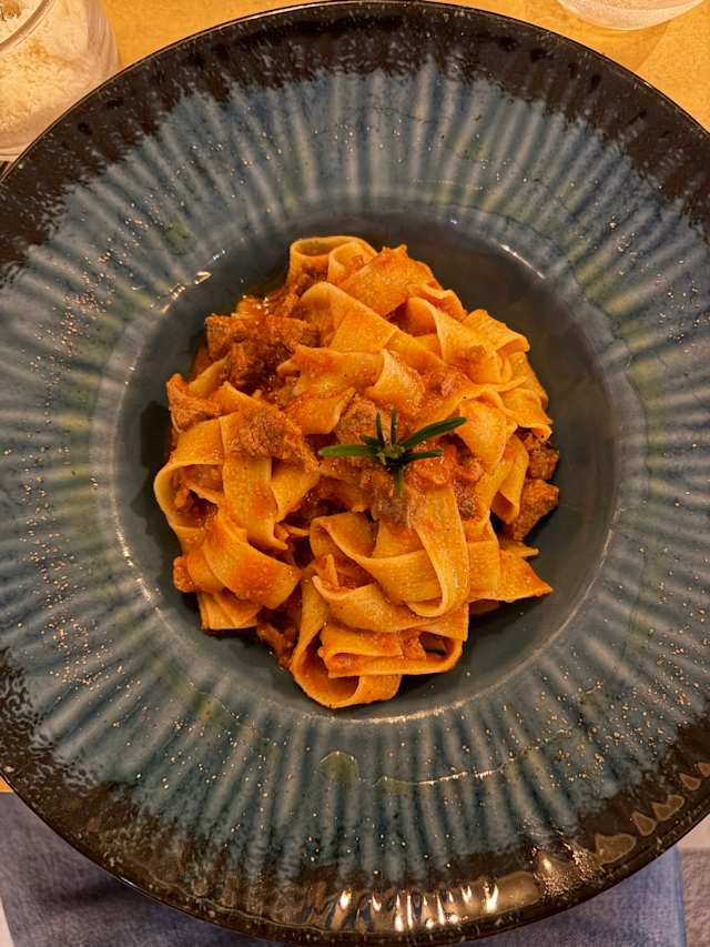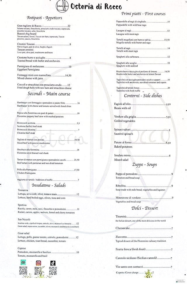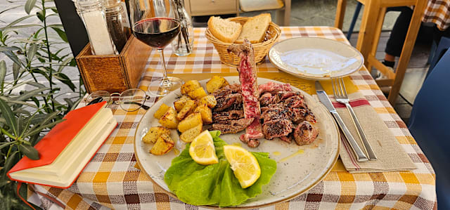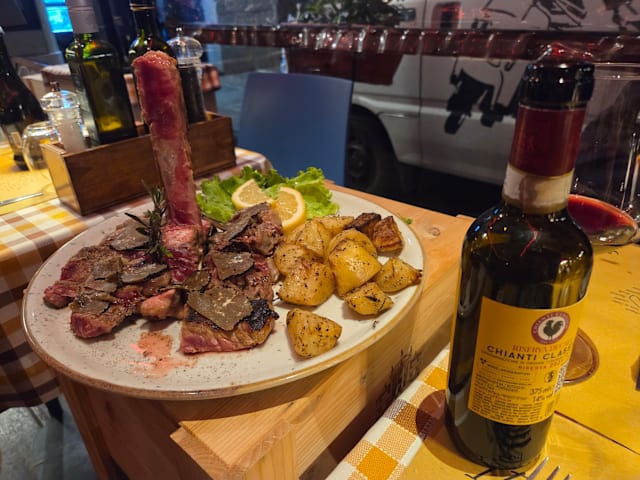 10/10I ordered the bistecca di chianina and a glass of Chianti, finishing with a caffè macchiato. Everything was delicious and prepared in good timing. The wait staff were very kind. The osteria is on a quiet street and the outdoor ambience was delightful. Highly recommended.